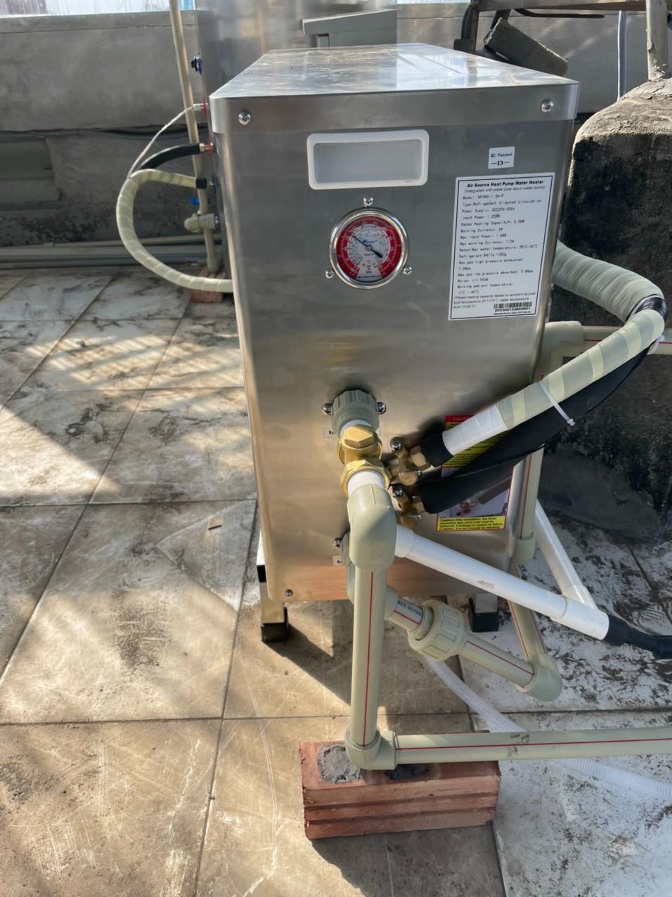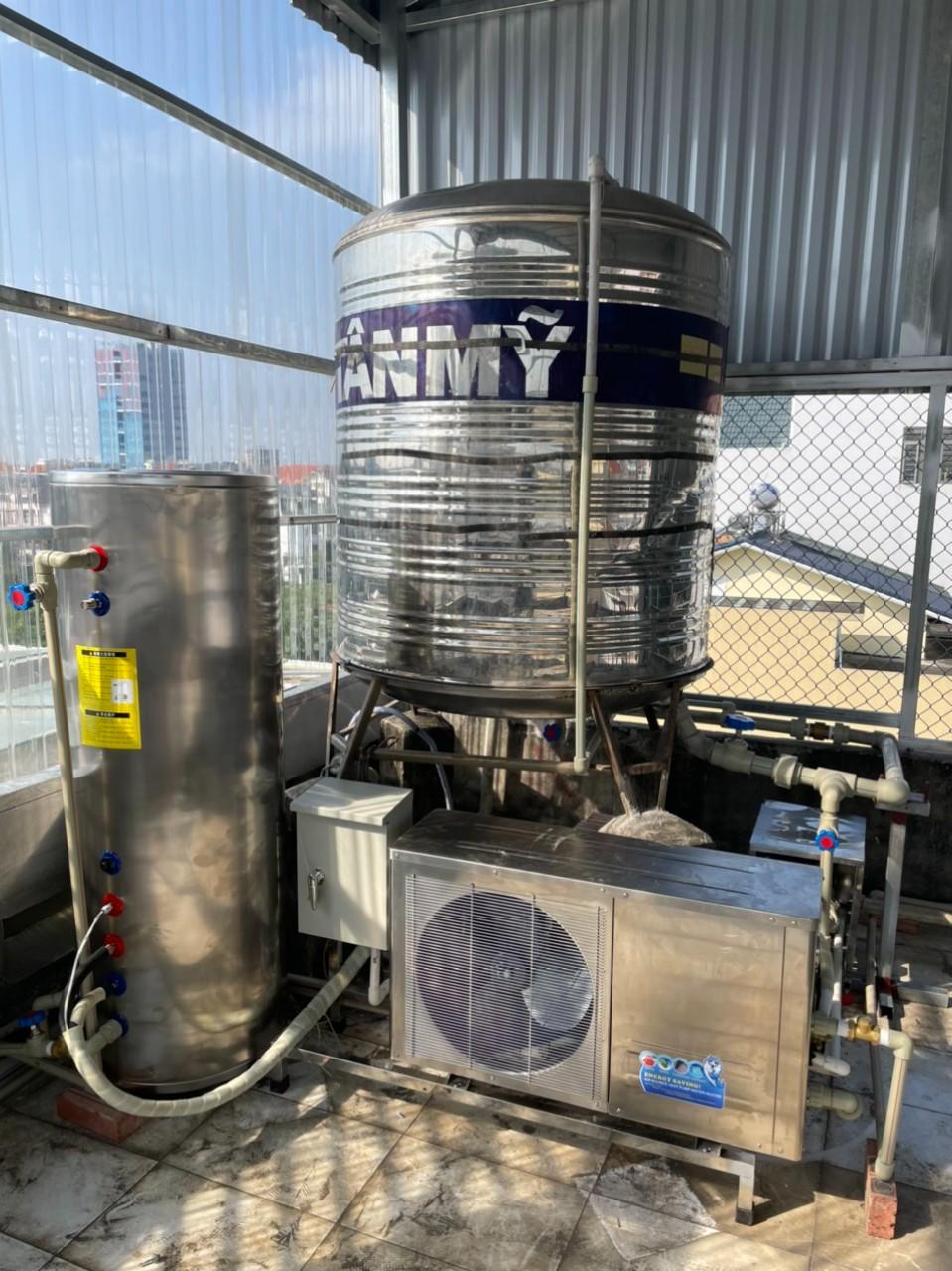 Lắp đặt hệ thống: Nước nóng trung tâm Heat pump model R417 – 1.5 P(F) có chế độ hồi, vỏ inox 304, công suất 1,5 HP, bồn bảo ôn 200L. Tích hợp Wifi. Với chi tiết cụ thể như sau: